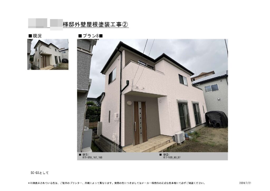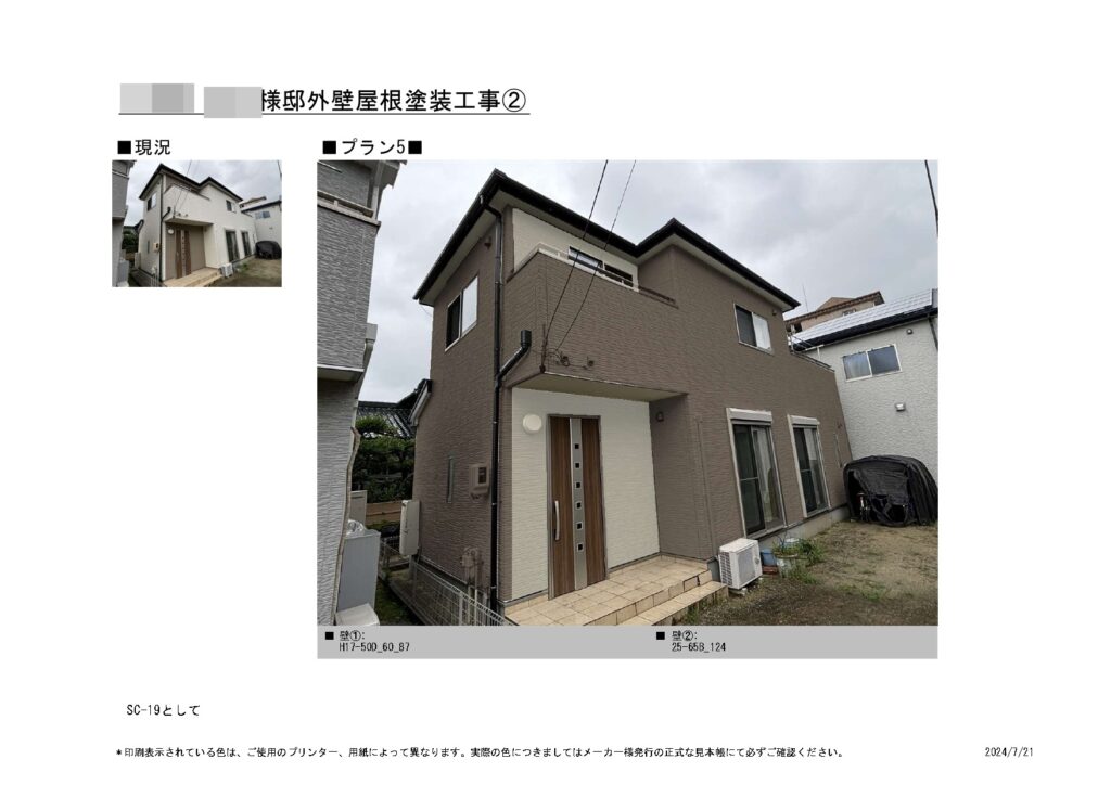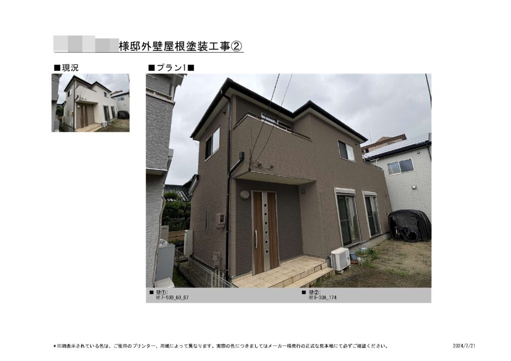 ご提案内容としましては、外壁・屋根に関しましてはお客様より美観性、耐候性に優れた塗料のご提案を希望されておりましたので、高耐久性と美観性の優れた無機エクスカリバーでご提案させて頂きました。こちらの塗料は公表されている無機含有率の高さで、高耐久性は勿論の事、美観性も維持してくれる塗料となります。また美観性を底上げしてくれる仕上げ材として、弊社の取り扱っているクリスタルシーズンという光触媒コーティングのご提案もさせて頂きました。こちらは塗料仕上げ剤として最後の工程に外壁や付帯部、などお家全体に吹付けるコーティング材となります。